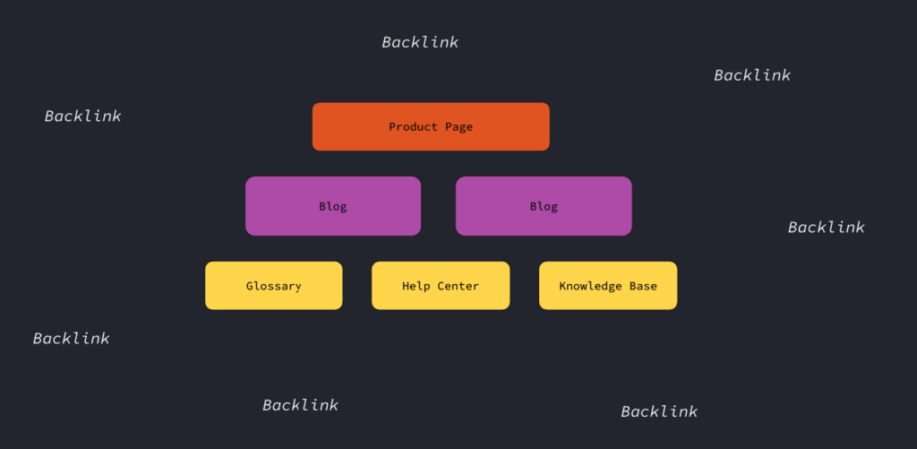 - Product Page: Links to Long Form Blogs, Competitor Alternatives, Best of Lists, and Short Form Blogs to support user education and conversion.